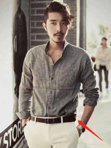 The most basic thing is to choose a belt size that fits your waist. The size of the belt should be two inches larger than the pants. After the belt is fastened, the end should be between the first and second pants loops. The length of the belt is between the first and second pant loops, you can measure your waist circumference. For example, if your waist circumference is 90cm, then the longest choice for the belt is 90+90/4 = 112.5. (Why divide by 4? Because the most suitable length of the belt is shown in the figure above, and the extra length shown in the figure above is less than 1/4 of the waist circumference) The shortest length of the belt, I think it should be waist circumference + 15cm. In other words, if the waist circumference is 90cm, the belt can be selected from105cm to 115cm. The specific length can be determined according to your own habits. Be careful not to measure your waist close to your body, but to measure the waist circumference on the outside of the pants, so that the measured length will be more appropriate. The width of the belt should be kept within 3-3.5 cm, not too wide or too thin.